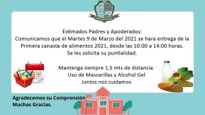 Comunicamos que el Martes 09 de Marzo del 2021 se hará entrega de la Primera Canasta de Alimentos 2021, desde las 10:00 a 13:00 hras.