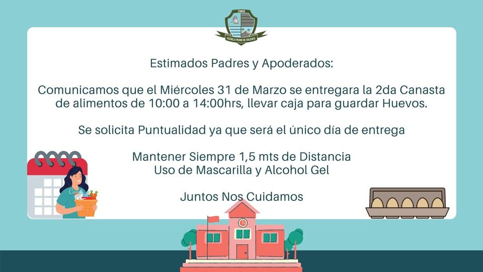 Comunicamos que el Miércoles 31 de Marzo del 2021 se hará entrega de la Segunda Canasta de Alimentos 2021, desde las 10:00 a 14:00 horas.