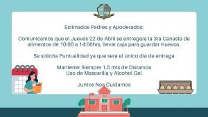 Comunicamos que el Jueves 22 de Abril del 2021 se hará entrega de la Segunda Canasta de Alimentos 2021, desde las 10:00 a 14:00 horas.