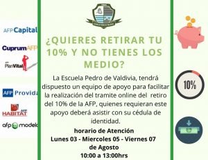 La Escuela Municipal Pedro de Valdivia, tendrá dispuesta un equipo de apoyo para facilitar la realización del tramite on-line del retiro del 10% de la AFP, quienes requieran este apoyo deberán acercarse al establecimiento el día Lunes 03, Miércoles 05 o Viernes 07 de Agosto desde las 10:00 a 13:00 horas, con su cédula de identificación.