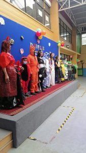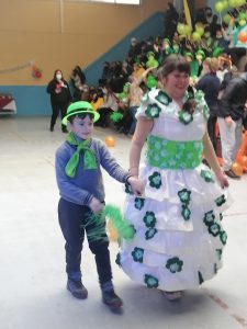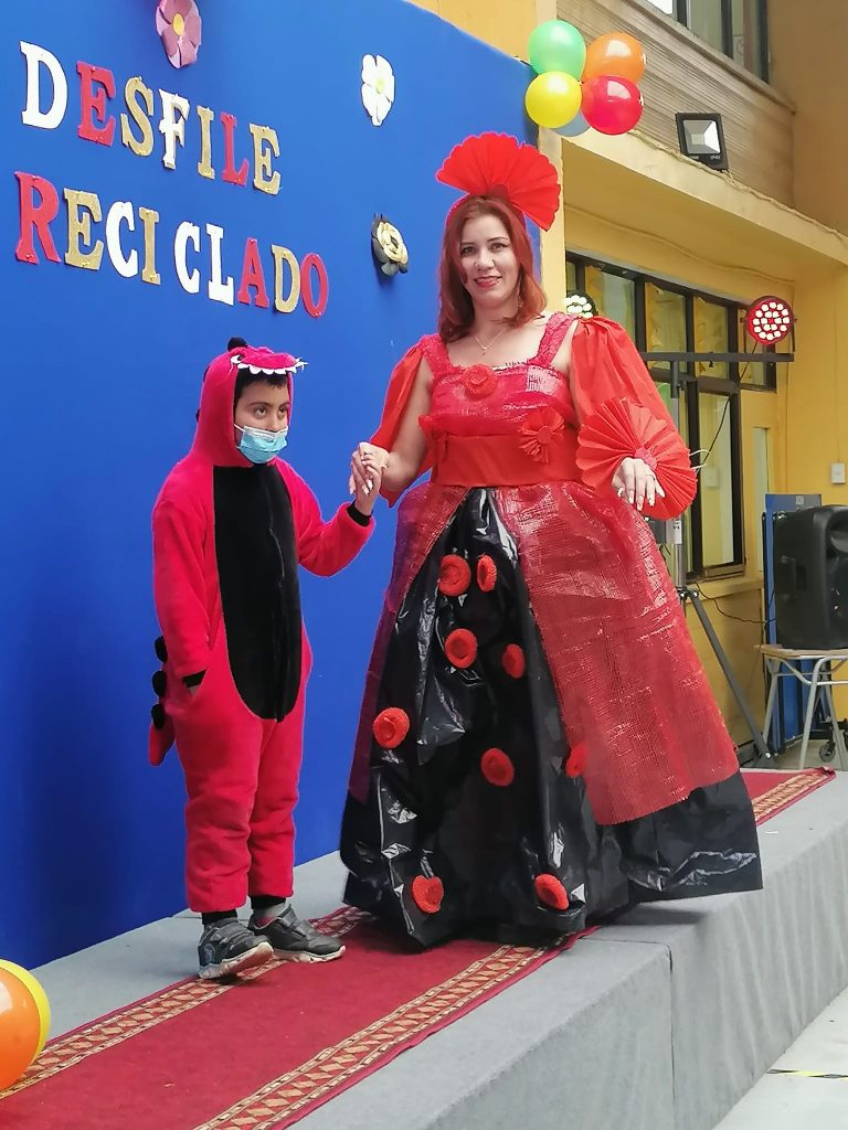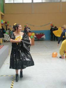 una de las actividades de la semana de aniversario de la escuela es el desfile de moda elaborado con material reciclado, lo cual los apoderados y las alianzas cumplieron al pie de la letra.