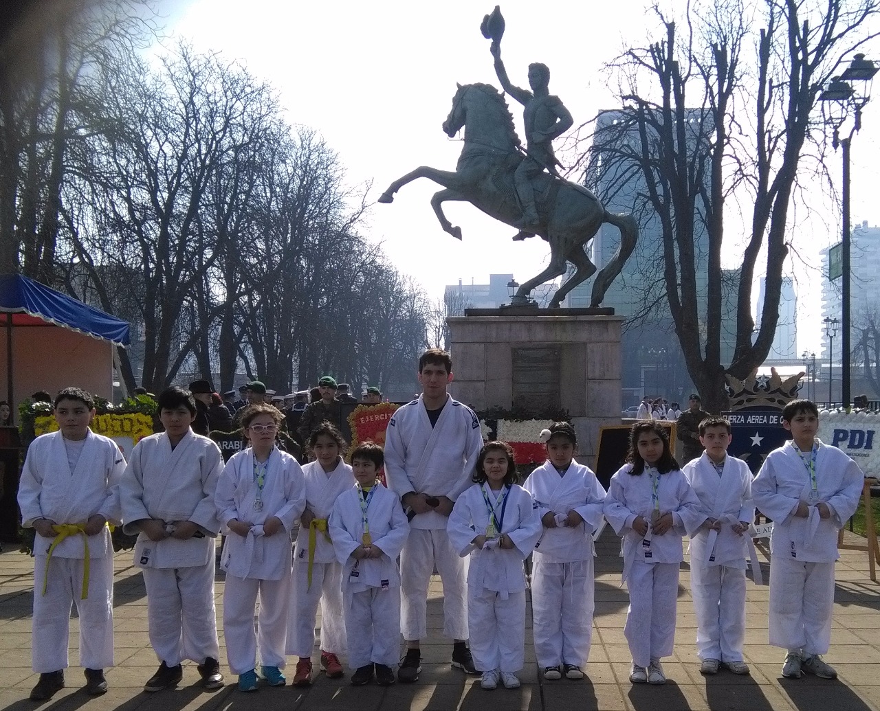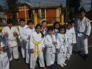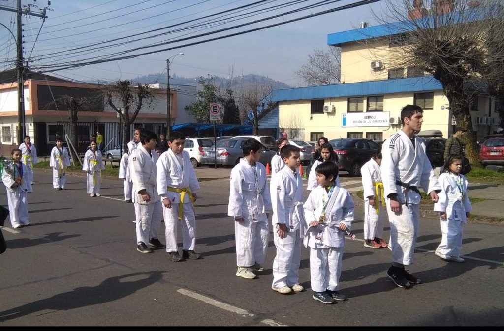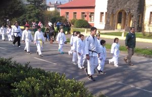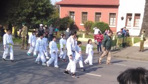 Los estudiantes que participan en el taller de judo del establecimiento participaron en el desfile en conmemoración del padre de la patria Bernardo O’Higgins, la cual fue llevada a cabo en la plaza Manuel Recabaren.