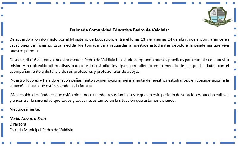 Estimada Comunidad Educativa Pedro de Valdivia:
