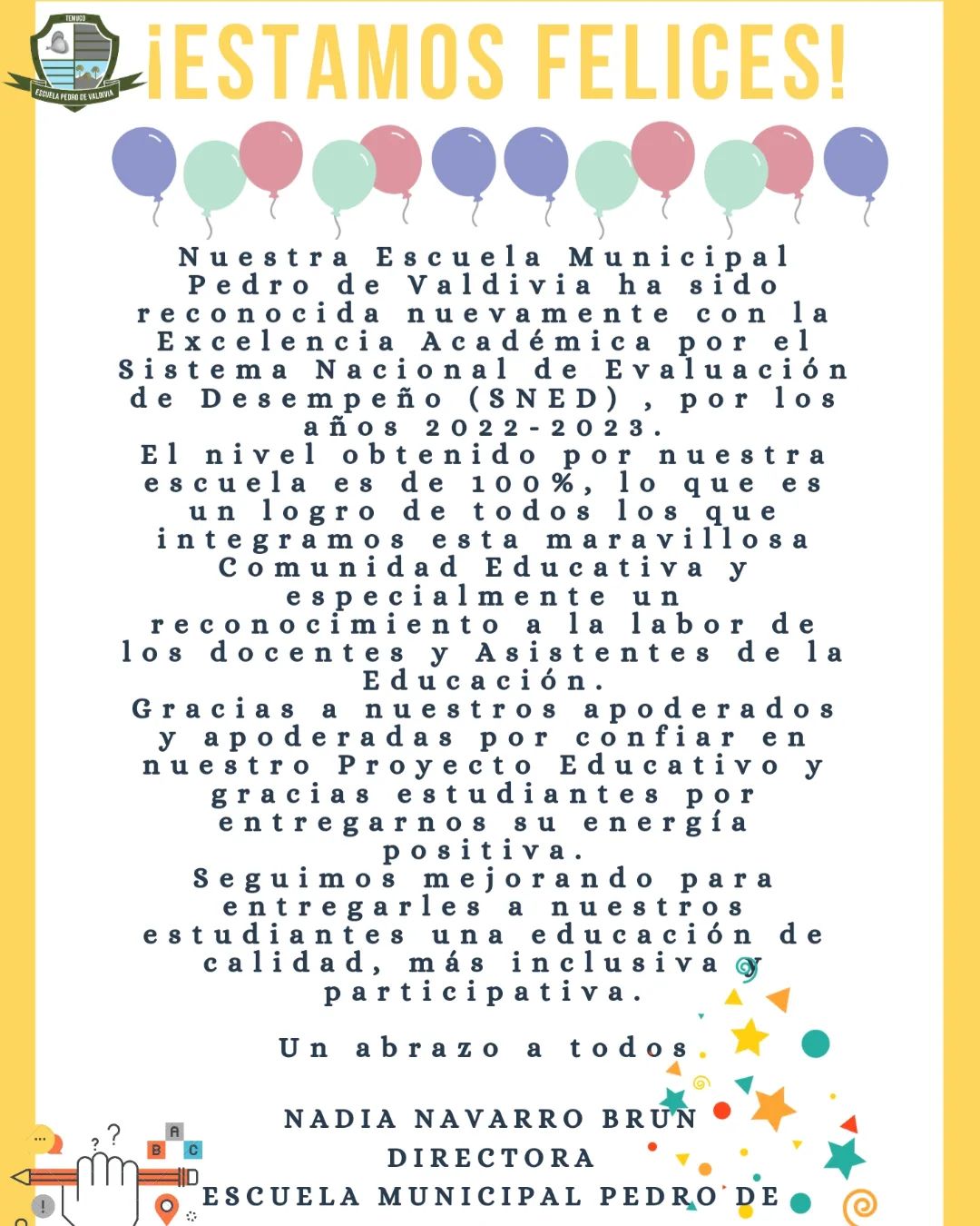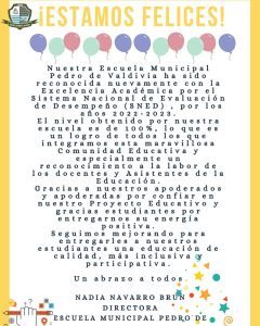 Nuestra Escuela Municipal Pedro de Valdivia ha sido reconocida nuevamente con la Excelencia Académica por el Sistema Nacional de Evaluación de Desempeño (SNED) , por los años 2022-2023.