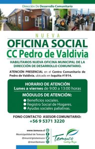 Se habilito la nueva oficina municipal de la Dirección de Desarrollo Comunitario. Atención presencial en el centro comunitario de Pedro de Valdivia, ubicado en calle Isquiña #1914.