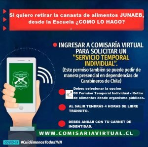Les recordamos que para asistir al establecimiento a retirar la canasta debe obtener su salvoconducto en la pagina web: www.comisariavirtual.cl y acceder tramites – permisos temporales y seleccionar la opción 08 Permiso Temporal Individual – Retiro de alimentos desde organismos públicos y llenar los datos.