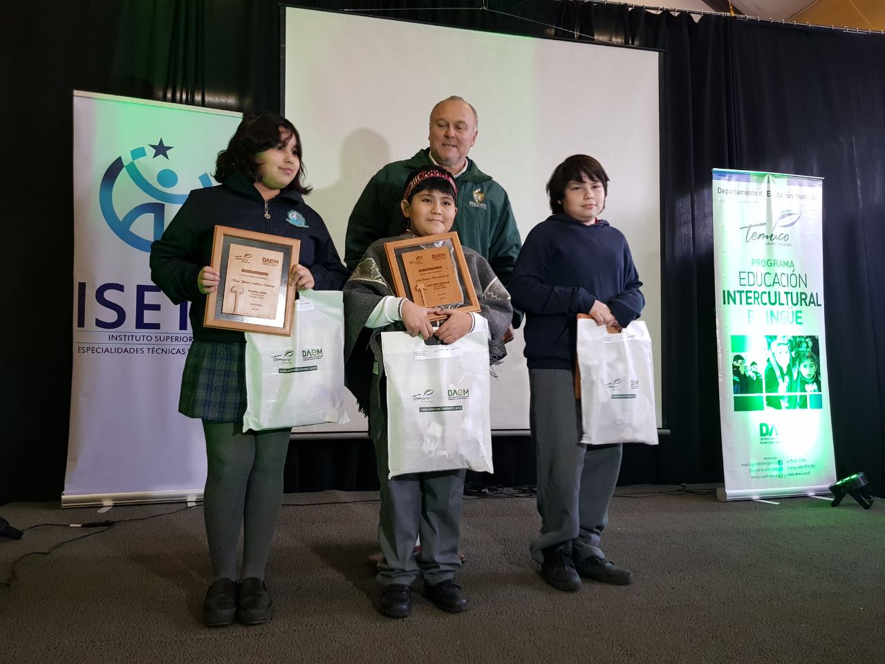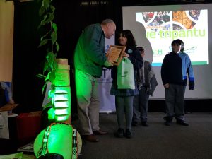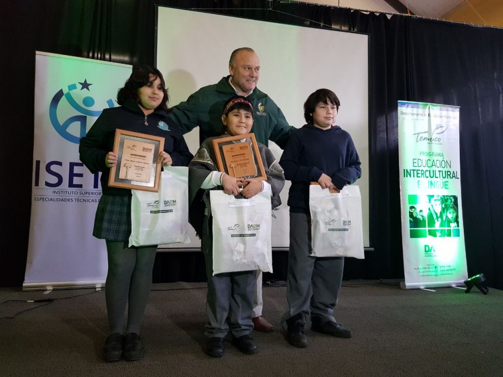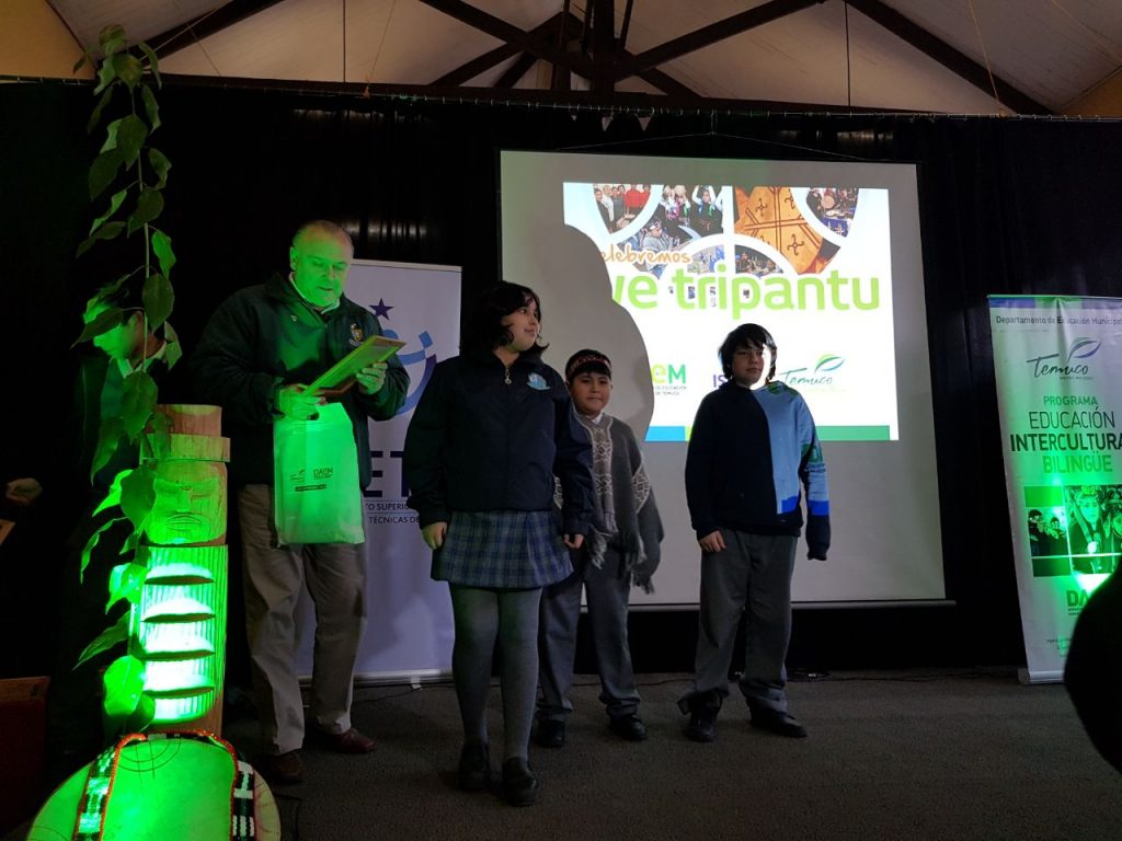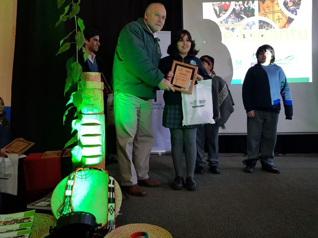 La estudiante Krishna Santibáñez Santibáñez de Sexto año de la Escuela Pedro de Valdivia, recibe un premio y reconocimiento por la participación en un concurso basado en el We Txipantu.