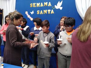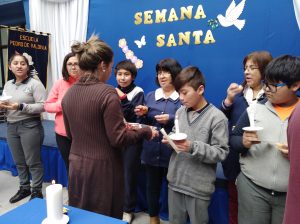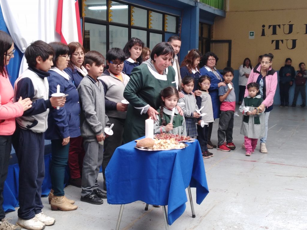 Durante la ceremonia, un representante de cada curso acompañado de su profesora jefe, pasaron a encender velas y compartir el pan y el Jugo, símbolo del cuerpo y sangre de Cristo.