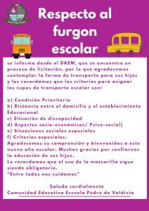 se informa desde el DAEM, que se encuentra en proceso de licitación, por lo que agradecemos contemplar la forma de transporte para sus hijos y les recordamos que los criterios para asignar los cupos de transporte escolar son: