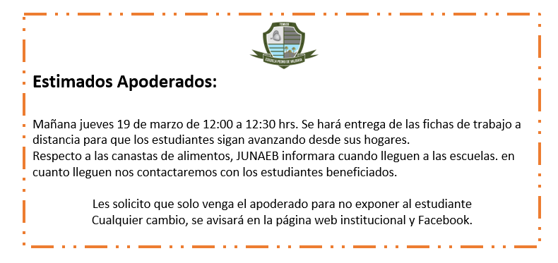 Mañana jueves 19 de marzo de 12:00 a 12:30 hrs. Se hará entrega de las fichas de trabajo a distancia para que los estudiantes sigan avanzando desde sus hogares.