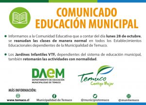 Se Informa que el Día Lunes 28 de Octubre se retomaran las Clases en Horario Normal.