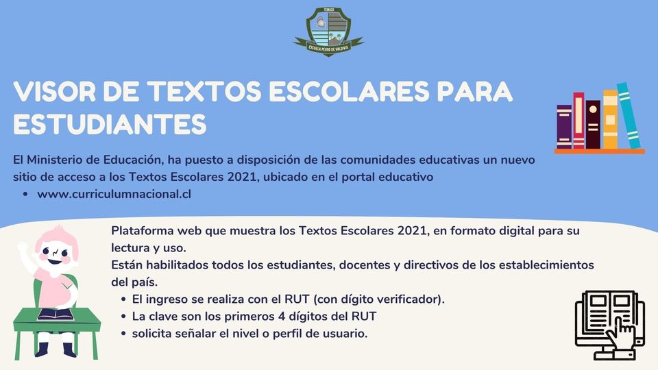 El Ministerio de Educación, ha puesto a disposición de las comunidades educativas un nuevo sitio de acceso a los Textos Escolares 2021, ubicado en el portal educativo www.curriculumnacional.cl Plataforma web que muestra los Textos Escolares 2021, en formato digital en su Lectura y Uso, están habilitados todos los Estudiantes, Docentes y Directivos de los Establecimientos del País